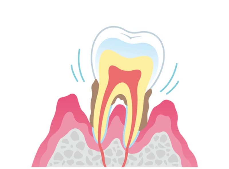 - 中等度の歯周炎では、歯周ポケットがさらに深くなり、歯槽骨の吸収が進行します。歯のグラつきや口臭など、症状が徐々に現れ始めます。